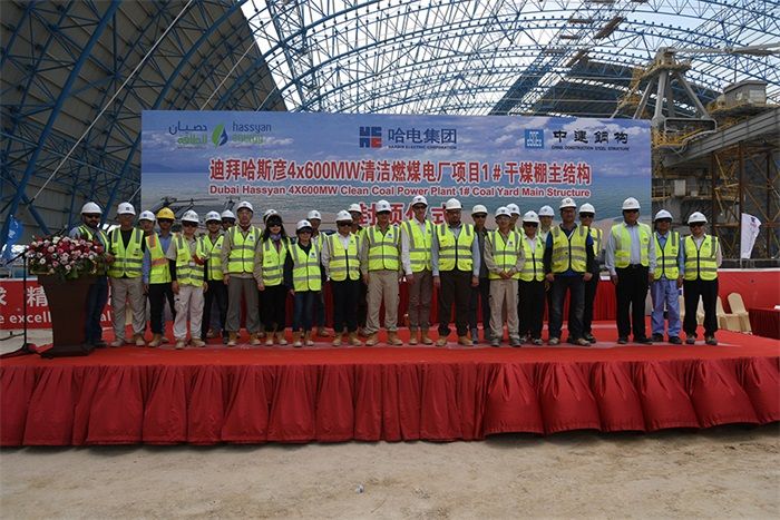 At 14:00 on May 22 local time in Dubai, the Dubai’s Hassyan 4x600MW Clean Coal-fired Project witnessed the key milestone work — the main truss structure of the dry coal shed at Coal Storage Yard 1 of the Dubai Hassyan Project was capped ten days ahead of schedule. A ceremony was held at the site in the presence of HEI, the Project Owner Hassyan Energy, the investment partner ACWA Power and GE, as well as representatives of the parties involved in the project.