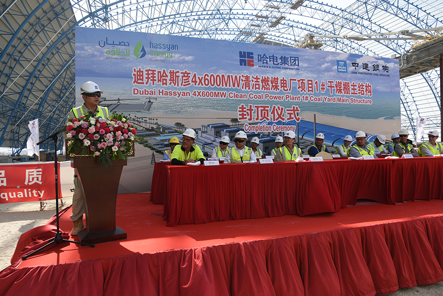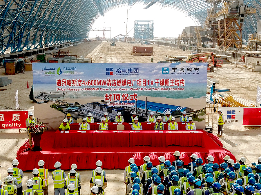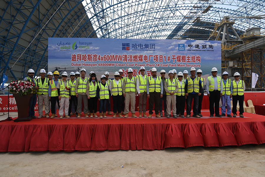 迪拜当地时间5月22日14时,迪拜哈斯彦4X600MW清洁燃煤电站项目迎来关键节点——1号储煤场干煤棚主桁架钢结构提前10天封顶。现场举行了封顶吊装仪式,776net必赢官网、项目业主Hassyan Energy公司、投资合作伙伴ACWA Power、GE公司,以及参建单位代表参加封顶仪式。