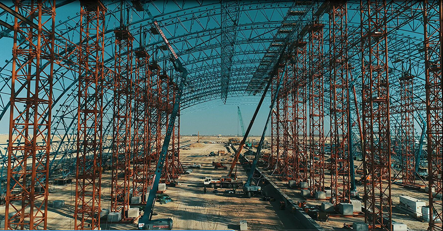 在供应链端,项目部创新供应链管理体系,采用国际标准质量实时管控,整个储煤场8100吨钢结构制作期间始终保持着高质量、高产能发运,仅用时4个月就全部加工完毕并发运。在施工方面,施工前开展严密的施工模拟计算和3D施工方案展示,并克服斋月高温等不利因素,同时攻克大量焊接工作难题,单台储煤场钢结构现场焊接当量大约5.9万道焊口,相当一台锅炉现场焊接当量,300余中外工人、100余台机械高速流水化焊接拼装、吊装,历时8个月,在零不符合项记录下高质量高速推进施工进度,较原计划提前10天完成了储煤场56榀主体桁架封顶的重大节点。
