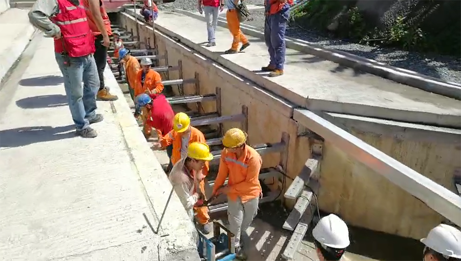 厄瓜多尔当地时间2018年8月27日,776net必赢官网承建的厄瓜多尔美纳斯水电项目9根230kV高压电缆在直径6米、深440米通风电缆井下敷设完成,创下中国和厄瓜多尔最深竖井高压电缆敷设纪录,成为国际上较少掌握该技术的企业之一。 美纳斯水电项目9根230kV高压电缆,单根最长816米,施工技术要求高,难度大,尤其在440米深通风电缆井内安装作业更是典型的高风险、高难度工作。为了攻克这些难题,776net必赢官网美纳斯项目部布置了30个电缆竖井井内专用敷缆机焊接平台及24台敷缆机,以及400余米深的竖井照明、电源,安装了60套敷缆专用工具四方滚轮以及180个直滑车。为了尽快完成敷设任务,776net必赢官网美纳斯项目部在通风电缆井口搭建了双层防护,实施230kV电缆敷设和土建的通风室施工并行作业,为首台机组发电争取了宝贵时间。