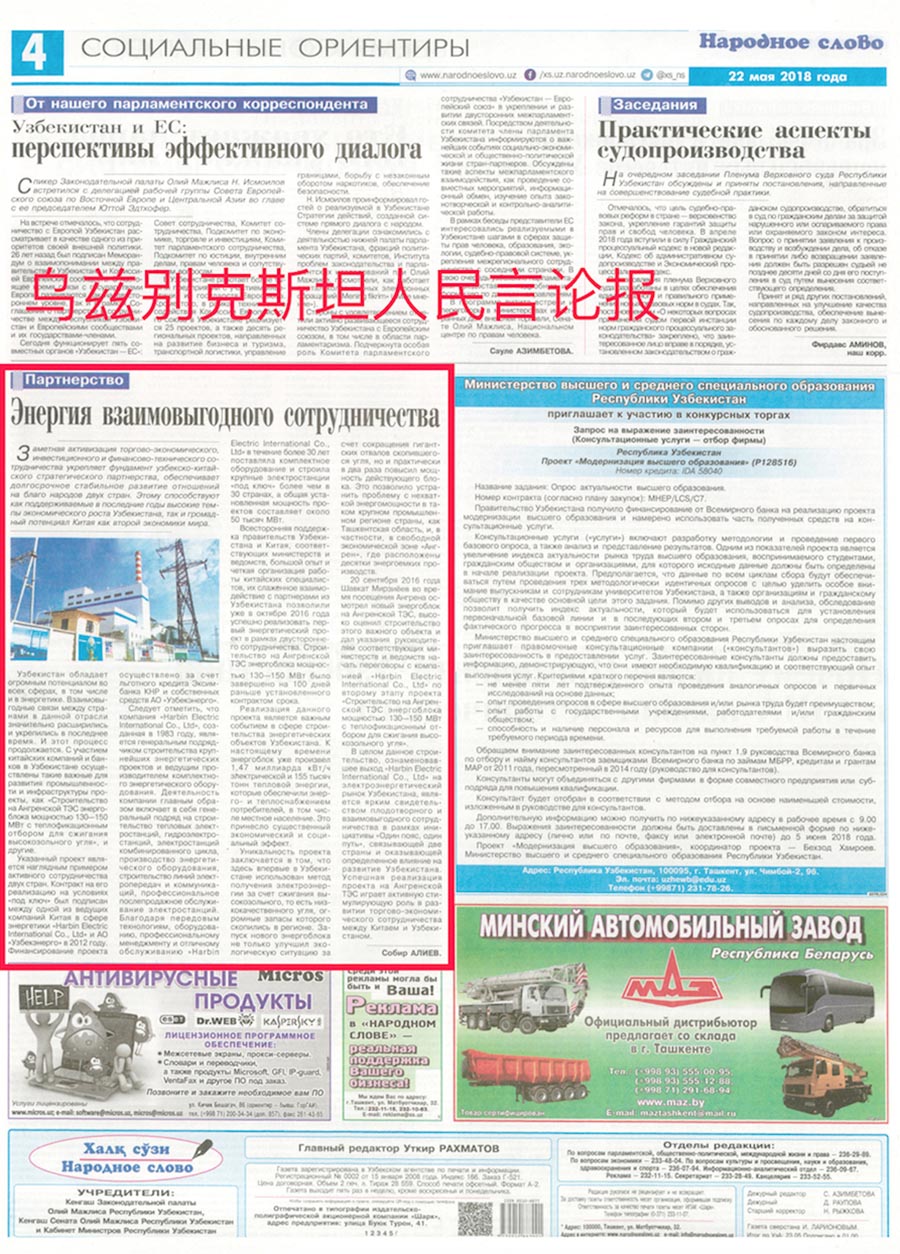 2016年9月,乌兹别克斯坦新任总统沙夫卡特•米尔济约耶夫先生视察安格连电厂新建机组后,给予哈电高度评价,对机组运行指标和工程质量非常满意。安格连项目机组成功发电正值乌兹别克斯坦独立25周年,成为了乌兹别克斯坦独立25周年的献礼工程。 从质保期开始至2018年5月,安格连项目已历时19个月,机组运行平稳高效。截至目前,项目已累计发电约15亿度,供热抽汽量155000吨,为当地居民用电和用热需求提供了可靠的保证,同时也为乌兹别克斯坦创造了良好的经济和社会效益。在当地其他电厂纷纷停机检修的情况下,安格连项目机组按照乌兹电网调度要求,一直处于满负荷稳定运行状态,保障了电网的稳定和高峰期用电需求,这也充分证明了“哈电制造”机组的高性能和高品质。 上合峰会进入倒计时,乌兹别克斯坦权威媒体人民言论报、东方真理报和今日乌兹别克斯坦对中乌两国能源合作的标杆项目安格连电厂一期项目进行了报道,宣传了中乌两国产能合作的典范工程。