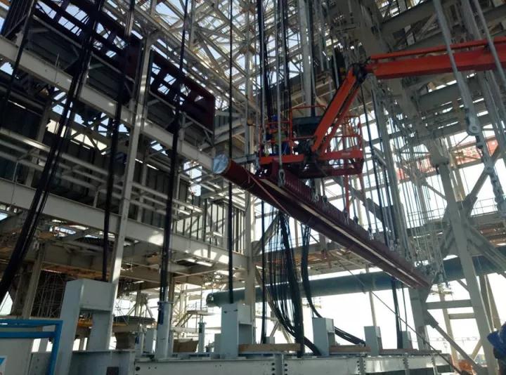 哈翔项目1号锅炉受热面顶棚出口集箱重达18.6吨,采用80T平臂吊吊装作业,就位标高为5.7米,采用举人车进行载人穿装吊架。顶棚出口集箱吊装前,哈翔项目承建单位天津电建对整体吊装作业进行了施工安全和技术交底,工程部、质量部及GE工程师利用内窥镜再次对集箱内部清洁度进行检查确认。吊装过程中,哈翔业主、776net必赢官网及天津电建对现场进行了安全布控,确保施工的安全顺利进行。受热面安装采用了新施工工艺。根据前、后炉膛特点,锅炉分为前后炉膛两部分安装。前炉膛部分:在BB、BC、BD、BE柱头位置各布置4台液压提升装置 (8台330t+8台220t),对A、B、C、D板梁及水冷壁、延伸侧墙过热器、高温过热器、高温再热器、后屏过热器、分隔屏过热器、顶棚过热器、刚性梁等设备整体逐步提升就位。 哈翔项目1号锅炉受热面安装正式开始,标志着776net必赢官网实现了哈翔项目1号锅炉整体设备安装工程又一个重要里程碑。