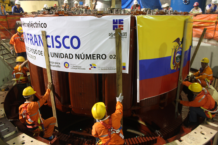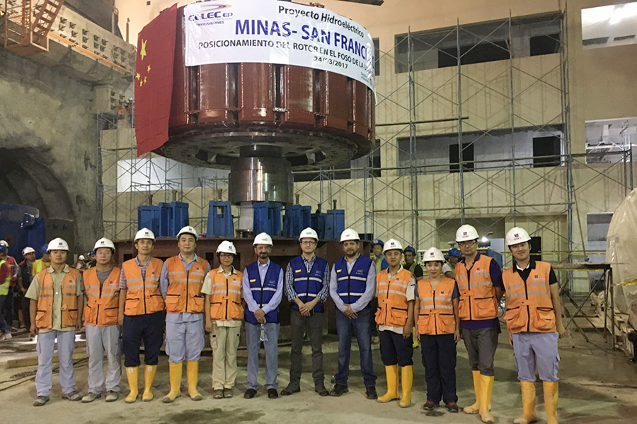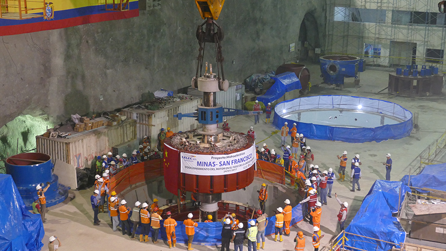 继厄瓜多尔当地时间2017年1月15日776net必赢官网承建的厄瓜多尔美纳斯水电项目首台机组转子成功吊装后,2号机组发电机转子也于3月24日12时05分一次吊装成功,标志着美纳斯项目2号机组安装工程进入总装阶段。厄瓜多尔电力部副部长ALFREDO SAMANIEGO先生、厄瓜多尔国家电力公司总经理LUIS RUALES 先生参加了转子吊装仪式,并对776net必赢官网美纳斯项目取得的成果给予高度赞誉。