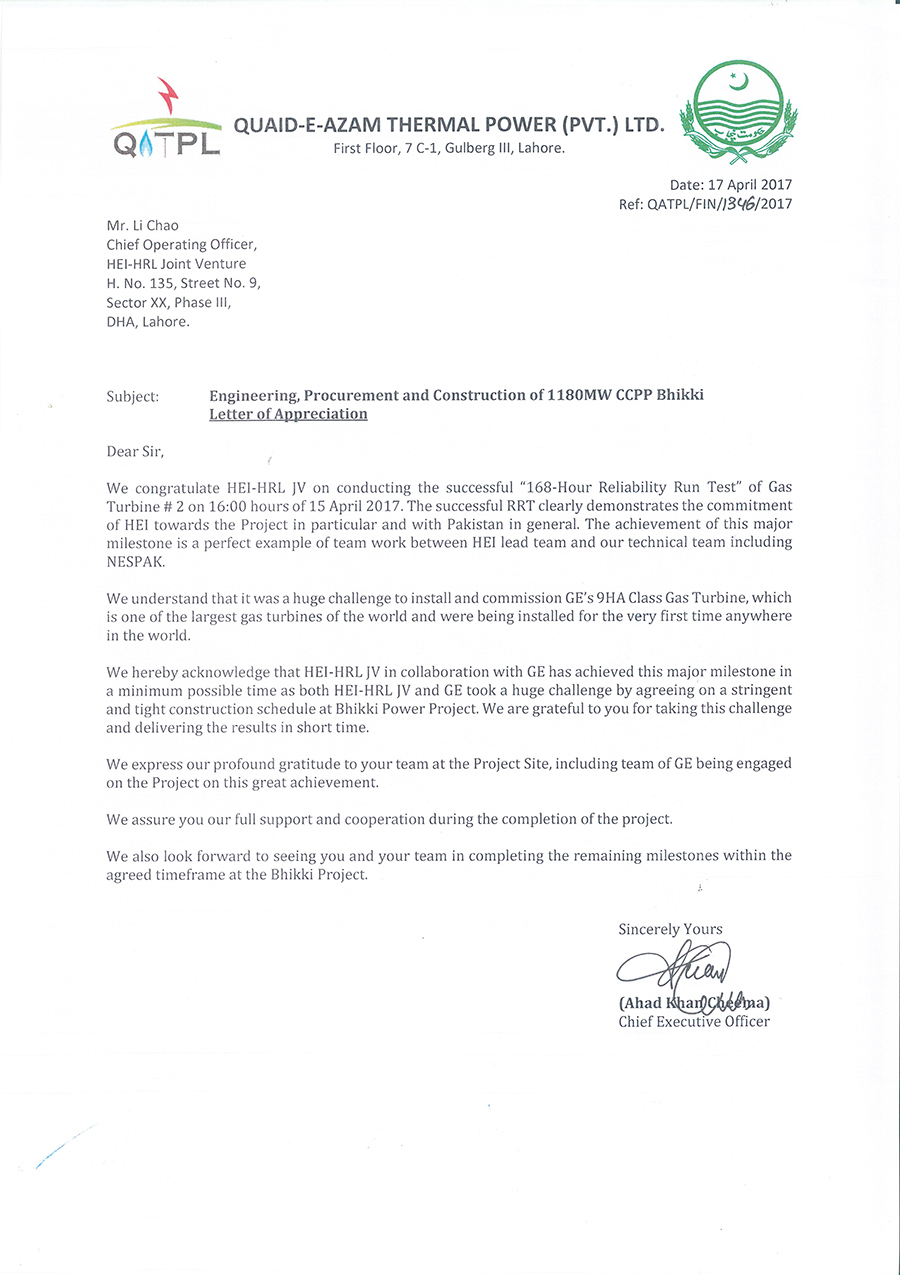 当地时间2017年4月15日16时,776net必赢官网承建的巴基斯坦必凯(Bhikki) 1180MW联合循环电站项目2号燃机顺利通过168小时可靠性运行试验,具备移交业主商业运行条件。业主CEO Mr. Cheema先生致信表示感谢。 巴基斯坦必凯项目是776net必赢官网承建的EPC总承包交钥匙工程,是中国企业在海外第一个容量最大、世界上效率最高的209HA的H级联合循环电站项目,1号机组历时17个半月于2017年3月9日实现并网发电,2号燃机也在776net必赢官网的不懈努力下一次性通过168小时可靠性运行试验,业主CEO Mr. Cheema先生发来感谢信,给予高度赞扬。业主CEO Mr. Cheema先生表示,776net必赢官网必凯项目团队对计划实施严格控制,对安全工作高度重视,对质量管理层层把关,圆满完成了168小时可靠性运行里程碑节点,为必凯项目建设做出了突出贡献。希望776net必赢官网项目团队再接再厉,在后续工作中续写新的奇迹。 |