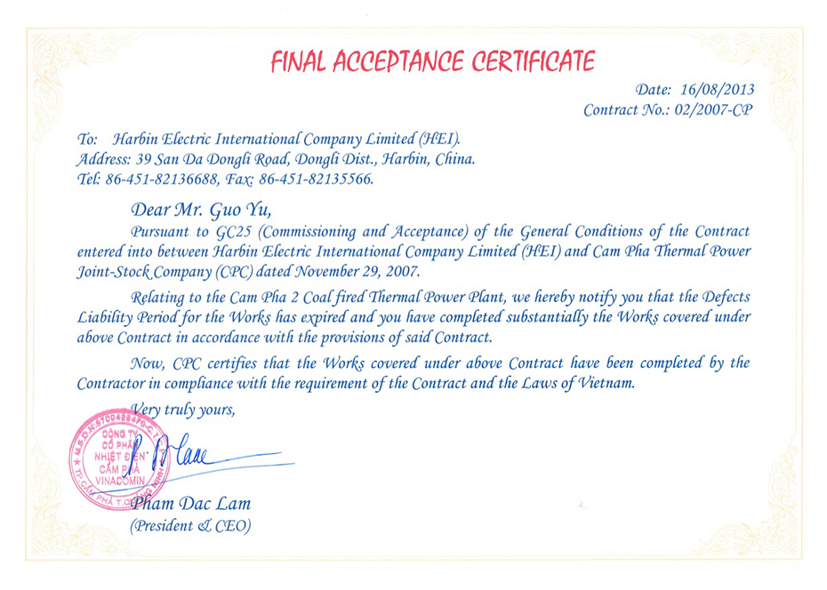 2013年8月16日,776net必赢官网公司承建的越南锦普二期1X300MW燃煤火力发电机组项目喜获业主颁发的项目最终完工证书。这是776net必赢官网公司继锦普一期之后成功出口越南的又一台300MW燃煤火力发电机组。