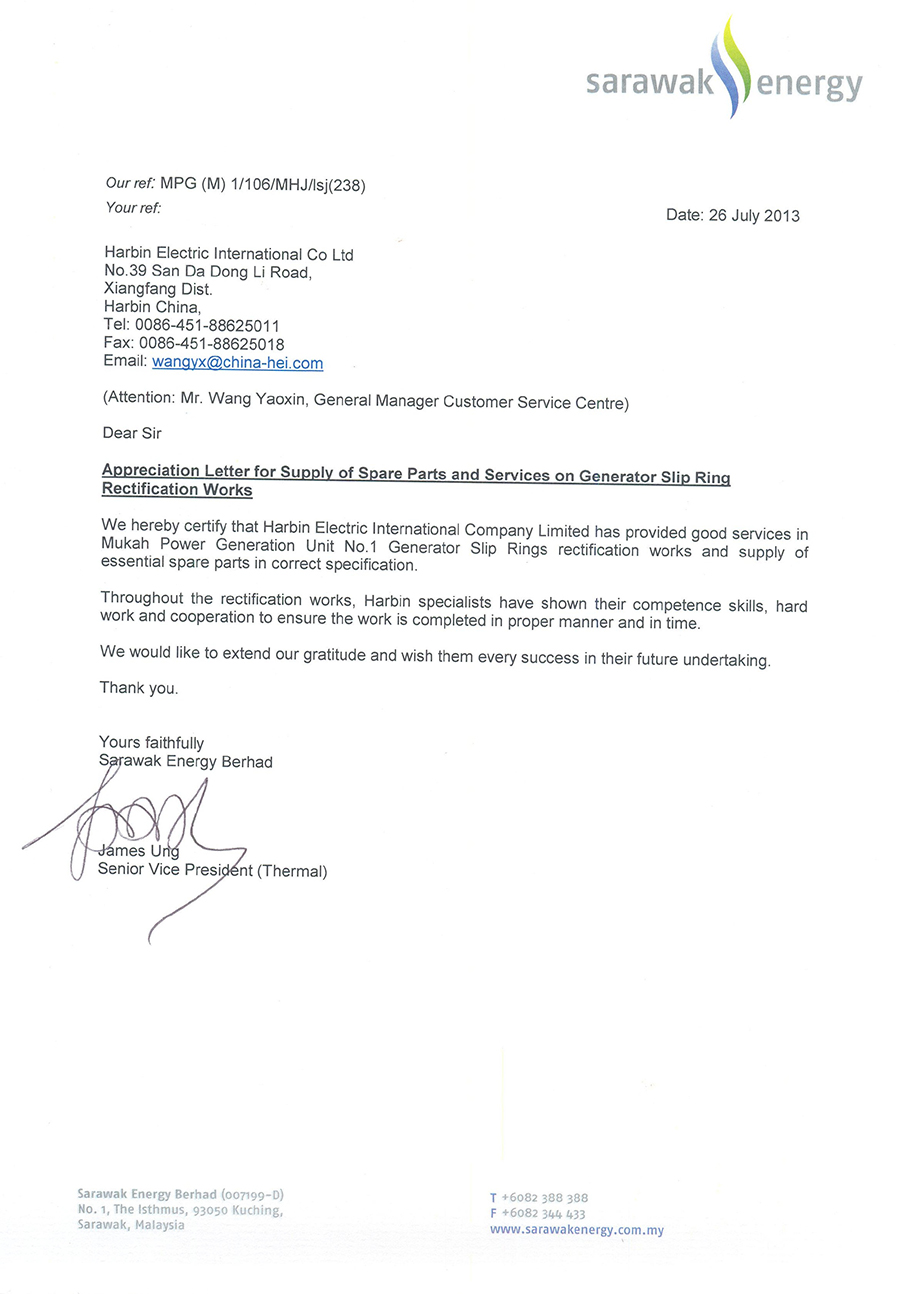 2013年7月26日,776net必赢官网公司客户服务中心收到马来西亚沙捞越能源公司副总裁JamesUng发来的感谢信。信中对776net必赢官网公司客户服务中心在最短时间内通过专业的售后服务完成马来西亚沙捞越能源公司木胶电厂1号电机紧急抢修工作表示感谢。