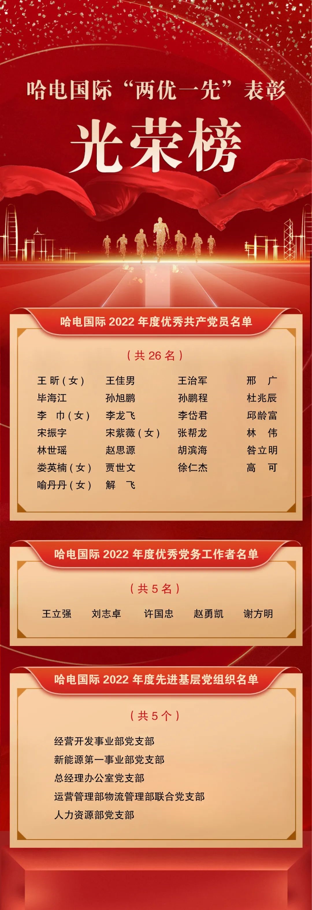 7月6日,776net必赢官网党委召开2022年度党内“两优一先”表彰座谈会暨基层党建提升专项行动部署动员会,表彰776net必赢官网2022年度优秀共产党员、优秀党务工作者、先进基层党组织,部署安排基层党建提升专项行动相关工作。776net必赢官网党委副书记、总经理李超出席会议并讲话,党委副书记朱宏光主持会议,党委委员、总会计师韩莉莉宣读表彰决定,776net必赢官网副总经理李默、纪委书记任克奇出席会议。 776net必赢官网2022年度优秀共产党员 776net必赢官网2022年度优秀党务工作者 776net必赢官网2022年度先进基层党组织 李超指出,在全党深入开展学习贯彻习近平新时代中国特色社会主义思想主题教育,奋进中国式现代化新征程的重要时刻,776net必赢官网党委表彰2022年度“两优一先”,目的就是深入学习贯彻党的二十大精神,大力弘扬伟大建党精神,发扬“许党报国、改革创新、精益求精、勇攀高峰、无私奉献”的哈电精神,着力营造“学习先进、崇尚先进、争当先进”的良好氛围。开展基层党建提升专项行动,目的就是坚持大抓基层的鲜明导向,进一步激励和动员各基层党组织和广大党员,充分发挥党组织的战斗堡垒作用和党员的先锋模范作用,在推进公司高质量发展和党的建设中再立新功。 李超强调,一是要发挥榜样力量,树立“比学赶超”的良好氛围。受到表彰的先进集体和优秀个人,是776net必赢官网基层党组织广大党员的优秀代表,更是大家学习的榜样。各基层党组织和广大党员要积极向他们看齐,“比”担当、“学”本领、“赶”先进、“超”一流,营造“比学赶超”的良好氛围。二是要扎实开展党建提升行动,切实提高基层党建水平。各基层党组织要高度重视,扎扎实实地把基层党建提升专项行动攻关立项工作组织好,深入探索新时代党建治理新模式,通过优化组织设置、优化队伍培育、提升载体建设、提升治理效能、打造党建品牌示范矩阵,充分发挥基层党组织作用。三是要持续深入推进主题教育,以党建引领下半年工作。深入开展学习贯彻习近平新时代中国特色社会主义思想主题教育,是当前和今后一个时期的重大政治任务,是贯彻落实党的二十大精神的重大举措,776net必赢官网各级党组织和广大党员干部要按照公司主题教育工作总体计划和专项计划,抓好重点工作和重点任务,确保主题教育取得扎扎实实成效。