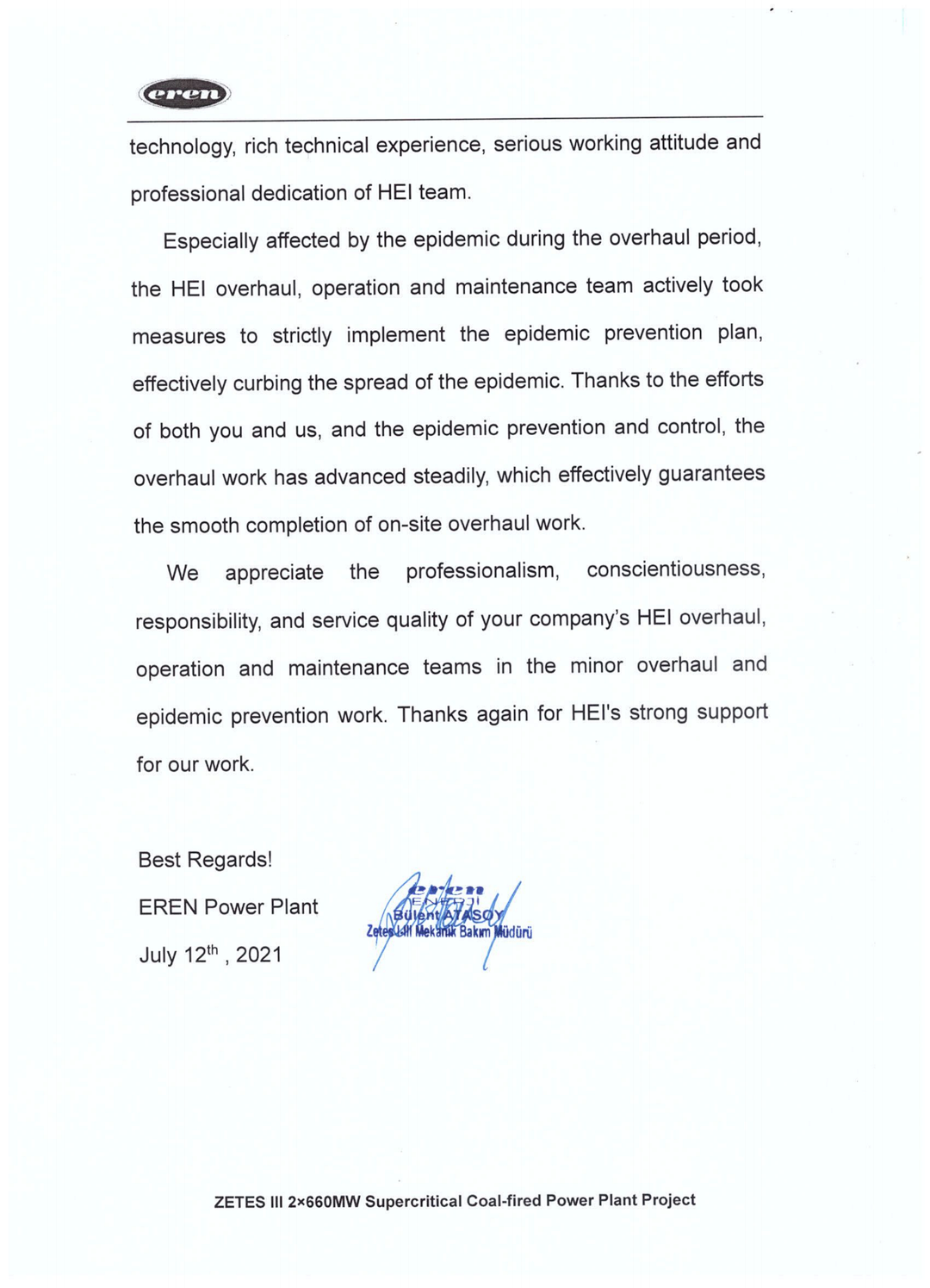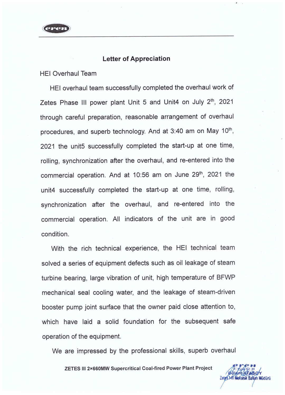 7月12日,776net必赢官网土耳其泽塔斯三期检修项目4号、5号机组正式获得业主签发的检修验收报告,获得业主高度评价。776net必赢官网再次向EREN业主展示了其先进的组织管理能力和技术水平。 6月21日,土耳其泽塔斯三期项目4号机组顺利完成检修任务,于29日10时56分一次冲转成功,并于30日10时49分一次并网成功,重新投入商业运行。7月12日,该项目正式获得业主签发的机组检修验收报告。 土耳其泽塔斯三期项目4号机组缺陷问题一直困扰业主多年,期间业主也曾组织过其他检修队伍对该机组进行过多次检修,但效果一直不理想。本次检修前,停机过程中出现的意外情况导致原定检修方案无法保证机组顺利启动和安全运行。776net必赢官网现场技术专家通过查阅设备安装记录、DCS以往运行数据,并充分听取现场运行团队对设备以往运行状况的分析,同现场检修及监理团队充分论证新的检修工艺和各部件回装的关键数据,及时调整检修方案,确保本次检修的成功完成。 本次检修任务的顺利完成,极大的增加了业主对776net必赢官网的信任,也为以后的检修工作打下了坚实的基础。 图文 | 刘武峰 编辑 | 李忠贺 审核 | 范乐乐