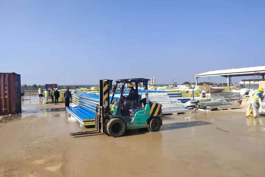 1月23日,伊拉克阿玛拉项目第一批船运货物在伊拉克巴士拉乌姆卡萨港清关完毕后全部运抵阿玛拉项目现场。本批材料为776net必赢官网及分包单位的生活临建板房材料,总计31个集装箱,净重320余吨。利用除夕和初一2天时间,项目现场投入中方和属地员工40余人以及吊车、叉车和平板车等机械开展卸货,全部集装箱材料于25日(初一)完成掏箱并分拣归类完毕。