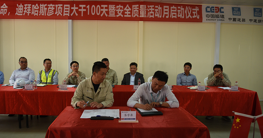 776net必赢官网“不忘初心、牢记使命”主题教育启动后,各部门高度重视,迅速行动,坚持“把开展主题教育与当前中心工作相结合”, 认真落实“守初心、担使命、找差距、抓落实”总要求,确保主题教育落地落实。 6月20日,迪拜哈斯彦项目部结合保项目发电目标完成,举行“大干100天暨安全质量活动月”启动仪式,签署节点计划完成责任状。776net必赢官网副总经理李超,以及中建三局二公司、中交二航院、天津电建、中建钢构等各主要分包单位领导出席仪式。