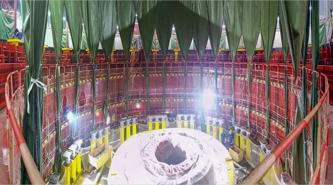 白鹤滩工程施工区全景。(图片来源:三峡集团) 6月13日,白鹤滩水电站右岸首台机组底环顺利吊入机坑,水轮机正式进入安装环节。 7月22日,白鹤滩水电站右岸首台机组转轮吊装成功。 8月30日,白鹤滩水电站右岸首台机组水轮发电机定子一次性顺利通过整体耐压电气试验。 金沙江川流不息,隆隆的江水击响哈电人冲刺百万千瓦机组这一世界水电“珠峰”的战鼓,在无数哈电建设者和三峡公司及各参建单位的共同努力下,这所世界在建规模最大的水电站——白鹤滩水电站右岸首台机组转子吊装进入倒计时。 底环吊装、转轮吊装、定子安装,以及即将开始的转子吊装、总装等重大工序,白鹤滩工程每一个节点的成功时刻只是一瞬,但在这一瞬前后,又藏有多少个鲜为人知的故事…… 2020年7月22日16时09分,机组转轮吊装成功