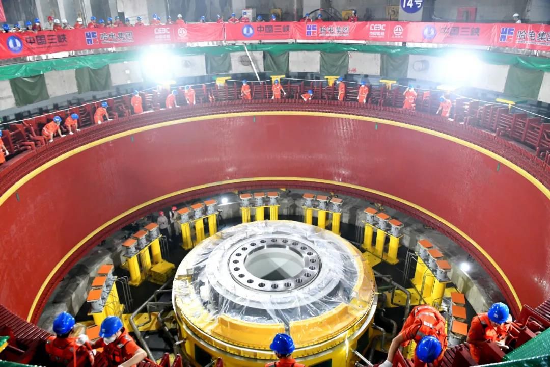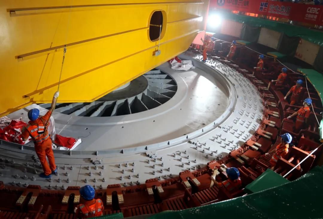 9月9日16时33分,白鹤滩电站安装现场响起热烈的掌声,由哈尔滨电气集团有限公司(简称“哈电集团”)研制的白鹤滩右岸电站首台百万千瓦水轮发电机组转子顺利吊入机坑。至此,世界单机容量最大的白鹤滩水电站右岸首台(14号机)转子实现成功吊装,标志着白鹤滩电站工程建设进入全面总装阶段。 伴随着哈电集团党委副书记、总经理吴伟章下达的“吊装”指令,白鹤滩右岸首台转子在两台1300吨桥机的协同配合下,缓缓起吊并平稳地向机坑移动。经过115分钟的吊运,转子顺利吊入机坑并与发电机主轴精准对接,转子吊装取得圆满成功。这不仅意味着14号机组顺利进入总装阶段,同时标志着白鹤滩右岸机组总装大幕正式拉开,右岸后续的7台机组也将在未来两年里陆续投入总装配。