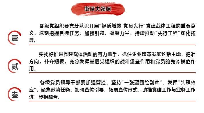 7月8日,哈电集团党委召开2020年“先行工程”推进交流会。 7月8日,哈电集团党委召开2020年“提质增效 党员先行”党建载体工程(简称“先行工程”)推进交流会,并就学习贯彻习近平总书记在中共中央政治局第二十一次集体学习有关“深入学习领会和贯彻落实新时代党的组织路线”的重要讲话精神提出工作要求。集团公司党委书记、董事长斯泽夫出席会议并讲话,党委副书记、董事孙智勇主持会议。 集团公司党委书记、董事长斯泽夫出席会议并讲话。 斯泽夫指出,“提质增效 党员先行”党建载体工程是集团公司党委推进党建工作与中心工作深度融合的重要举措,更是把学习贯彻习近平新时代中国特色社会主义思想引向深入、以高质量党建推进高质量发展的重要途径。两年多来,公司系统各级党组织精心组织、积极实践,结合实际开展了各具特色的载体活动,抓住了“党的建设围绕中心工作”这一根本,发挥了“党组织和党员作用”这一重点,结合了“立足实际开拓创新”这一关键,在推动深化改革、转型发展、科技创新、基础管理及党的建设中发挥了重要作用。