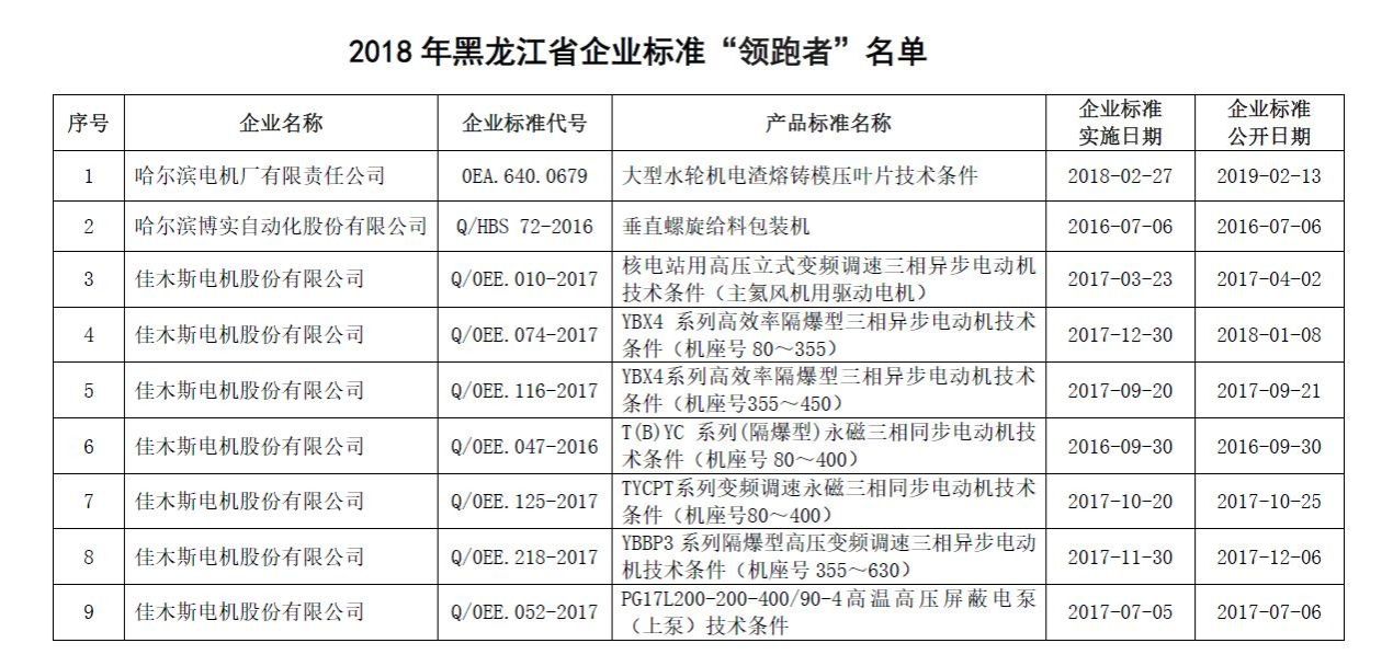 近日,黑龙江省市场监督管理局会同黑龙江省工信厅对17家企业31项企业产品标准进行了评价,认定了首批9个2018年黑龙江省企业标准“领跑者”中,哈电集团有8项技术标准,关键指标达到国际先进水平或高于同类国家基础、通用标准或行业标准,成为企业标准“领跑者”。 据了解,企业标准“领跑者”是指同类可比范围内公开的企业标准中核心指标水平领先的产品或服务,是深化标准化改革、全面提升产品和服务质量、推动中国经济迈向中高端水平的一项创新性工作。 黑龙江省首次实施企业标准“领跑者”制度,旨在引导激励企业积极制定实施先进标准,促进创新科技成果转化为标准,培育以技术、标准、质量、品牌为核心的竞争新优势,引领产业转型升级。 哈电集团8项企业标准“领跑者”: |