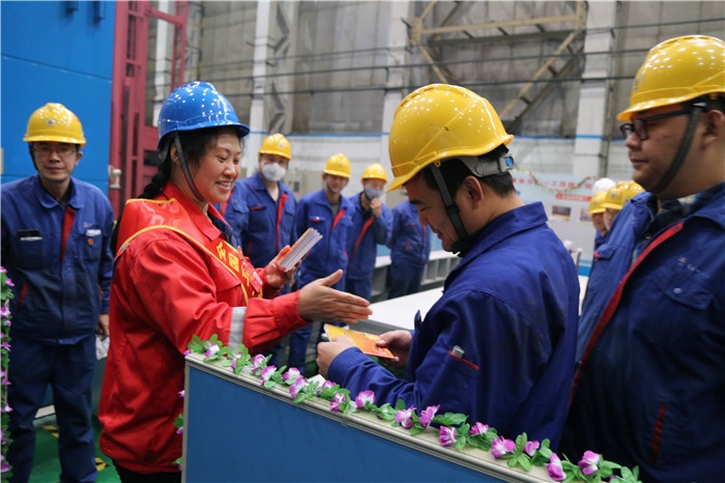 十九大代表、2016年全国五一奖章获得者荀笑红(右三)发放党的十九大精神进企业进车间进班组口袋本