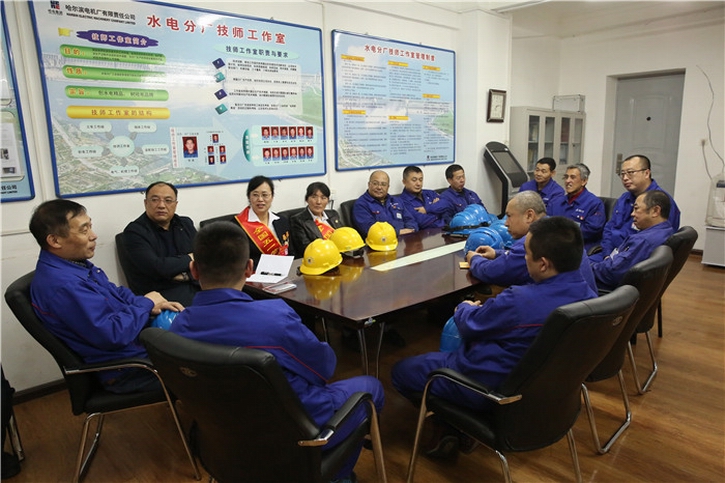 在电机公司水电分厂,党的十九大代表、全国劳动模范仲威平(正面左四)、全国五一劳动奖章获得者于丽霞(正面左三)与一线生产人员交流参加十九大盛会的切身感受 |