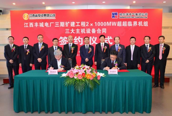 9月17日,哈电集团与江西省投资集团公司正式签订了江西丰城电厂三期百万千瓦二次再热超超临界机组三大主机成套设备合同。这是哈电集团又一次获得的成套百万千瓦等级三大主机设备合同,是对哈电集团自我成套能力的再一次检验。哈电集团董事长、党委书记邹磊,江西省投资集团公司总经理、党委书记姚迪明出席签约仪式并致辞。哈电集团副总经理、哈电股份总裁吴伟章和江西省投资集团公司副总经理、江西赣能股份有限公司总经理张惠良代表双方签署合同。 邹磊在致辞中首先感谢江西省投资集团对哈电集团的信任。他表示,百万千瓦二次再热超超临界机组是当今世界最先进的煤电机组,哈电集团与江西省投资集团合作建设丰城电厂三期项目,成套提供百万千瓦二次再热超超临界三大主机设备,对于哈电集团意义重大,对引领我国火力发电技术进步意义重大。哈电集团将全力以赴做好技术创新、项目管理和技术质量服务等工作,致力于为用户提供系统的解决方案。拥有60多年的历史底蕴和积累的哈电集团有信心、有能力把丰城三期项目做好做精,全力打造国内百万千瓦二次再热超超临界煤电机组的标杆工程。 姚迪明在致辞中表示,早在1993年丰城电厂一期项目中,双方就建立起良好的合作关系,多年来不断增强理解与信任。今天项目合同的签订,是丰电三期扩建项目关键性的一步,也标志着双方的合作站上了一个新的台阶,是双方在更多领域、更深层次开展合作的里程碑。他强调,依靠双方既往的合作基础,江西省投资集团公司与哈电集团在丰电三期项目上的合作将一路坦途。 哈电集团党委副书记冯永强,营销总监张海权及集团有关职能部门负责人、所属企业有关领导,江西省投资集团公司总经理助理李天晓,江西赣能股份有限公司党委书记刘昌辉,江西赣能股份有限公司副总经理、丰城三期发电厂总经理吴纪等领导参加了签约仪式。锅炉公司、汽轮机公司、电机公司的主要领导也在签约仪式上作了表态发言。 超超临界二次再热发电技术代表了当前世界领先发电技术,比常规一次再热机组效率提高约2%,具有高效率、低能耗、低排放等优势,对火力发电技术进步具有重要引领作用。江西丰城电厂三期项目的成功建设,将成为行业内的又一成功典范,必将助推国内燃煤发电技术的快速发展与进步。