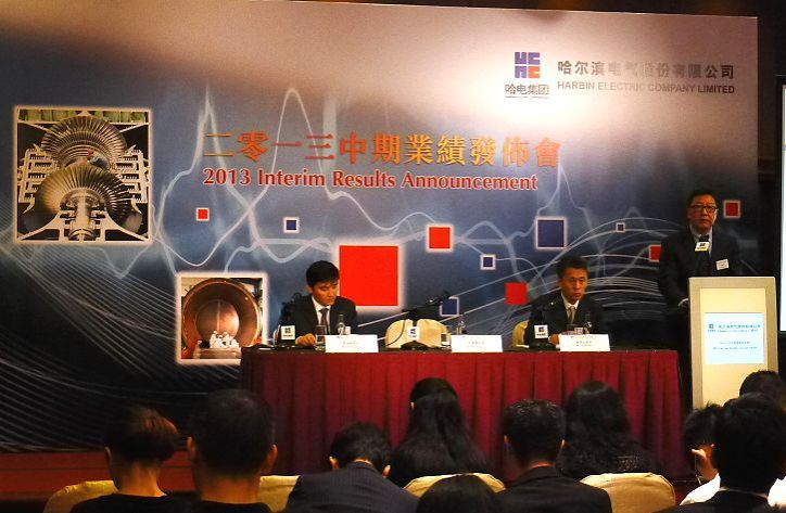 8月26日,哈电股份在香港举行2013年中期业绩发布会,哈电股份总裁吴伟章、副总裁刘智全、公司秘书高旭光出席会议。会上,吴伟章向广大投资者介绍了哈电股份2013年上半年的经营业绩及运作情况,与会哈电股份领导就投资者关心的问题一一进行了解答。