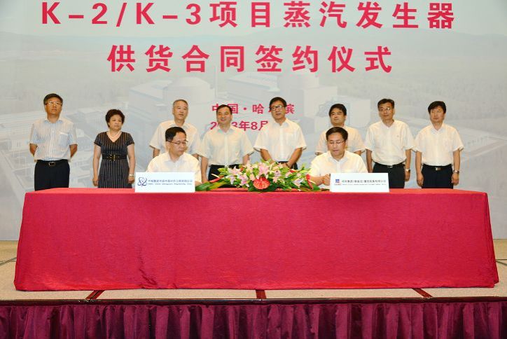 8月20日,哈电集团与中核集团K-2/K-3项目蒸汽发生器供货合同签约仪式在哈尔滨举行。中国中原对外工程有限公司总经理杨朝东和哈电集团(秦皇岛)重型装备有限公司董事长王晓辉分别代表双方在合同上签字。