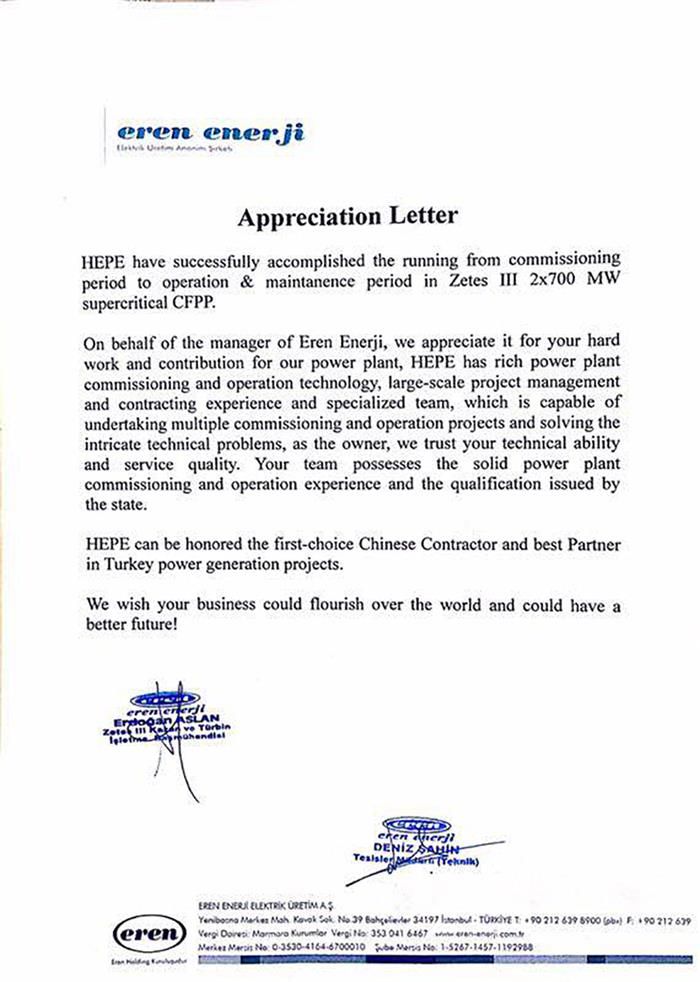 В благодарственном письме компания энергоресурсов и электроэнергетики Eren выразила полное доверие компании HEI в аспекте применяемых ей технологий и качестве предоставляемых услуг, высказала одобрение виртуозной техникой высочайшего уровня, применяемой компанией HEI при наладке и запуске электростанции, опытом управления крупномасштабными электростанциями, а также группой сотрудника специальности, является заслуженными квалификациями государственного уровня.