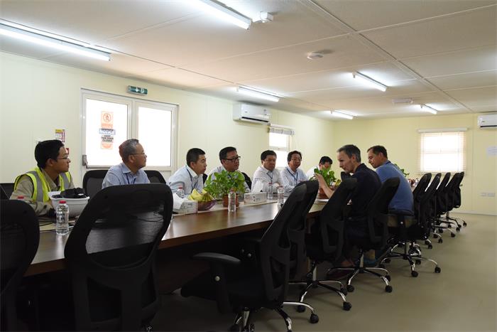 En el sitio del proyecto de Hassyan, Wu Weizhang se reunió con el señor PATXI, director ejecutivo de la empresa del proyecto de Hassyan, con el cual intercambió numerosas ideas sobre la colaboración en el proyecto y su estado de ejecución. Asimismo fue acompañado por el presidente de la junta directiva de HEI Guo Yu, el vicepresidente Wang Shimin y otros líderes para inspeccionar cada lugar de construcción en el sitio del proyecto, tras lo cual escuchó el informe de trabajo del departamento del proyecto de Hassyan de HEI.